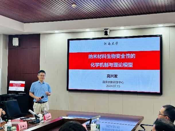 机制和理论模型”。报告中,他重点介绍了其课题组近期在纳米材料生物安全性方面的研究进展。主要内容包括:聚焦“纳米表面活性氧反应机制与规律”关键科学问题,进行了“机制-模型-验证”递进式研究。对真实纳米颗粒采用理想表面、理想颗粒近似,在研究共性反应机制基础上,运用表面催化和电子能带原理建立机制驱动模型,为模型发展计算机辅助方法进行模型验证与应用,验证了机制驱动模型及理论指导实验纳米毒理学研究新范式。