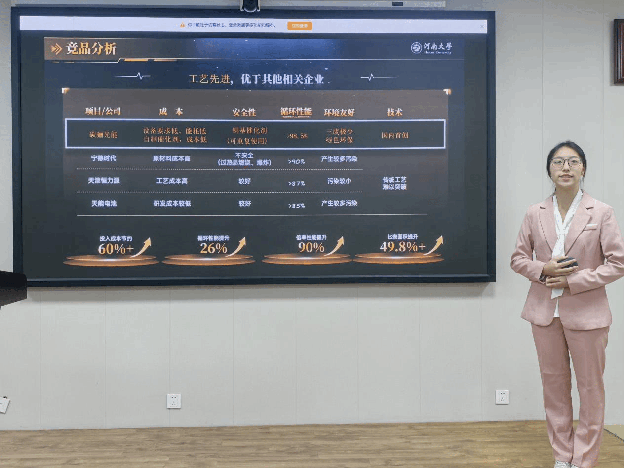 本次院赛按竞赛组别依次开展路演答辩,各赛道参赛团队紧扣组别主题,带来了各具特色的创业项目。在社会治理和公共服务赛道,智弈社、清风团队先后登场,围绕政务服务、公共卫生、消费生活等领域的社会治理痛点,展现了兼具实用性与创新性的解决方案;生态文明建设和绿色低碳发展赛道上,碳骊得珠、环宇智纳队、绿禾先锋队等5支团队,聚焦环境治理、清洁能源应用、可持续资源开发等方向,将绿色发展理念融入项目设计,为推动低碳发展贡献青年思路;最后是科技创新和未来产业赛道,愈感肤——可注射智能传感敷料研发组、智盾科技、风净无忧等16支团队依次上台路演,覆盖智能制造、人工智能、大数据、新能源等多个前沿领域,从智能传感敷料研发到氢能、锂电产业创新,从光催化技术应用到防腐技术突破,紧扣创新驱动发展战略的项目,彰显了河大学子在科技研发与产业转化方面的探索与尝试。