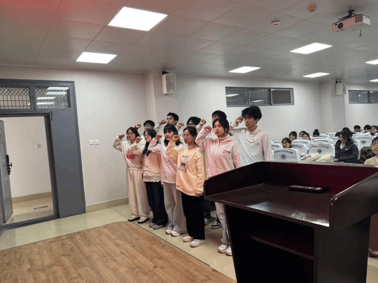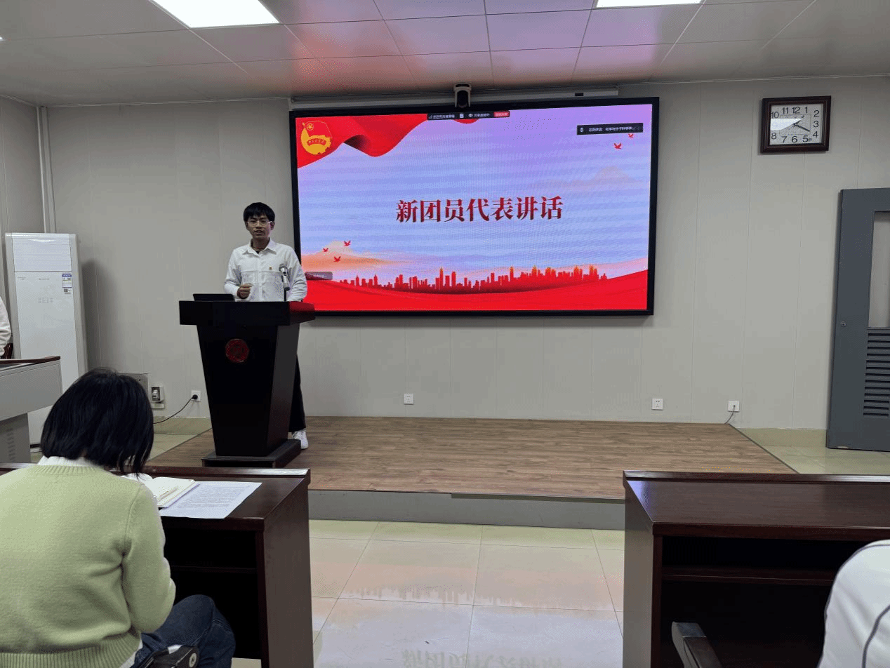 仪式在雄壮激昂的中华人民共和国国歌声中拉开序幕。团委副书记为新团员逐一佩戴团徽,并颁发团员证。金色的团徽在胸前熠熠生辉,标志着崭新的责任与光荣的使命。随后,全体新团员面向鲜艳的共青团团旗,举起右拳,庄严宣誓,铿锵有力的誓言在会场内回荡,表达了他们坚定跟党走、奋进新时代的赤诚初心与无悔选择。