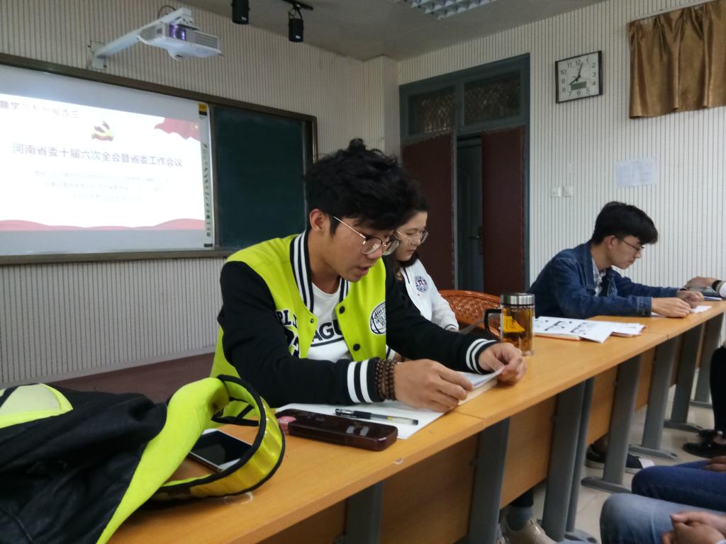 最后郭佳传达了河南省委十届六次会议暨省委工作会议精神。其主题是“高举习近平新时代中国特色社会主义思想伟大旗帜,以党的建设高质量推动经济发展高质量,一步一个脚印实现中原更加出彩的奋斗目标”。主要内容为中原更加出彩、推动经济发展高质量、推动党的建设高质量和争做出彩河南人。古老厚重的中原大地形成了以焦裕禄精神、红旗渠精神、愚公移山精神为代表的宝贵精神财富。塑造了河南人包容宽厚、大气淳朴的内在品格,艰苦奋斗、负重前行的实干精神,敢闯新路、奋勇争先的进取意识。