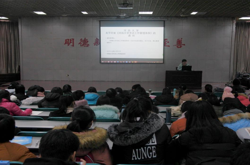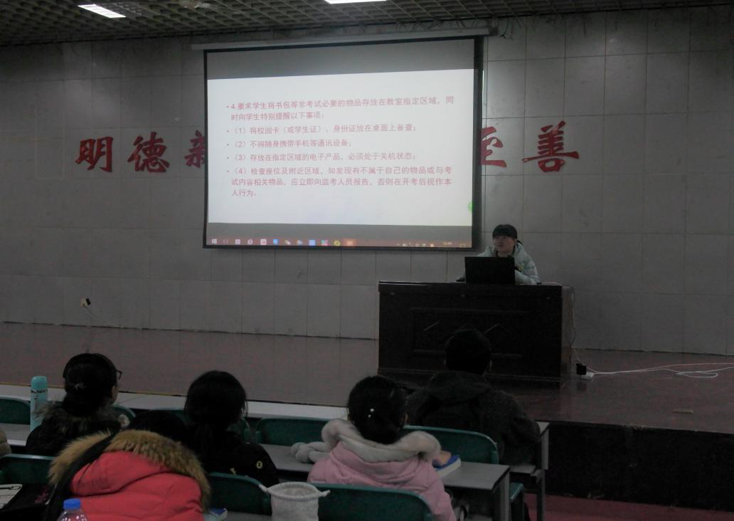 考试工作管理条例》,角度全面,内容丰富。马洁首先详细说明考试前物品的存放问题以及申请缓考的注意事项,随后通过举例分析考试作弊一经发现给予的处罚,提醒同学们一定要端正态度,放平心态,自觉遵守考场纪律,做到诚信考试。最后,马洁强调要抓紧时间复习,尽力查漏补缺。